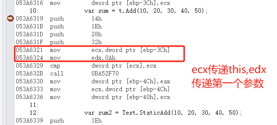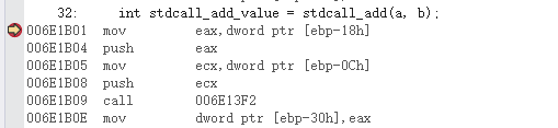 注意寄存器与栈是两片独立运行的区域,光从汇编代码,很容易陷入误区,就拿上图来说,从上往下阅读汇编,你会发现参数传递的顺序是30(1Eh),40(28h),50(32h),10(0Ah),20(14h)。明显不对,这是因为一个是寄存器,一个是线程栈,这是两个不相关的区域,谁前谁后都不违反从左到右的规定。不能死脑筋,寄存器与栈之间是存在位置无关性的。