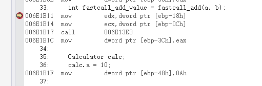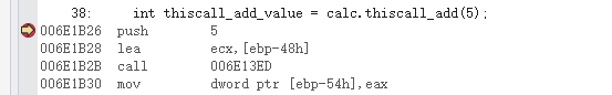 __thiscall | this指针通过寄存器, 剩余通过栈(右→左) | 被调用者清理栈 | C++类成员函数 |