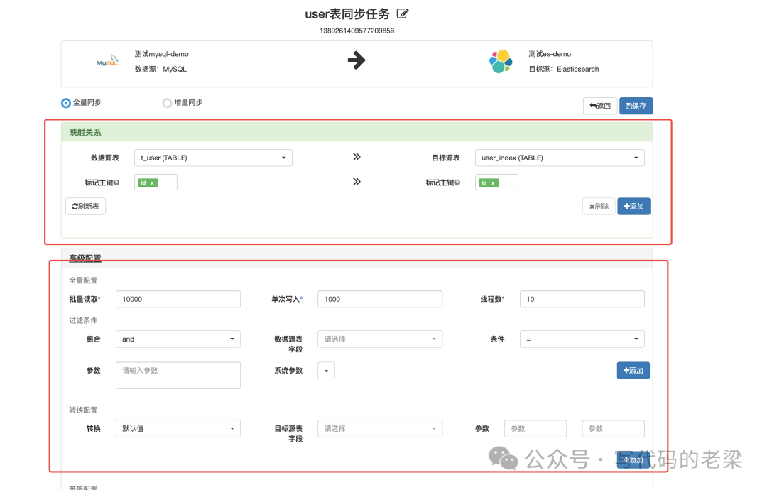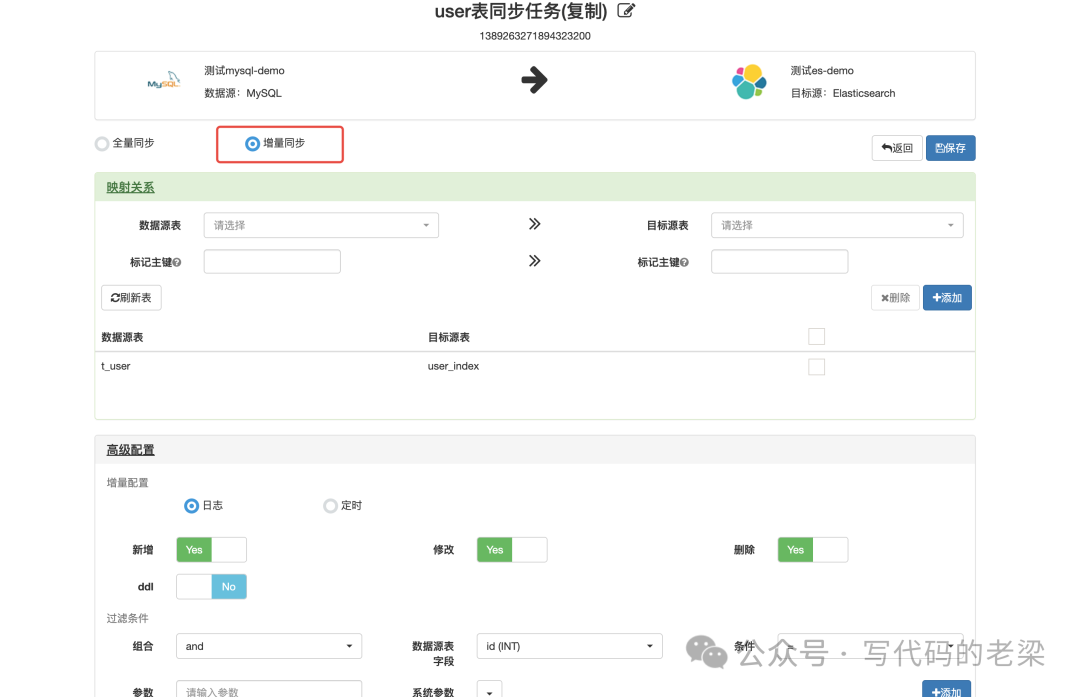 映射 关系注意主键id 也可以通过条件同步指定条件数据因为选择的是全量同步,所以说启动以后,同步完成任务就停止了,停止以后,我们把任务修改为增量同步,来同步增量的任务即可设置为增量以后 启动任务,后续的数据就会自动同步了