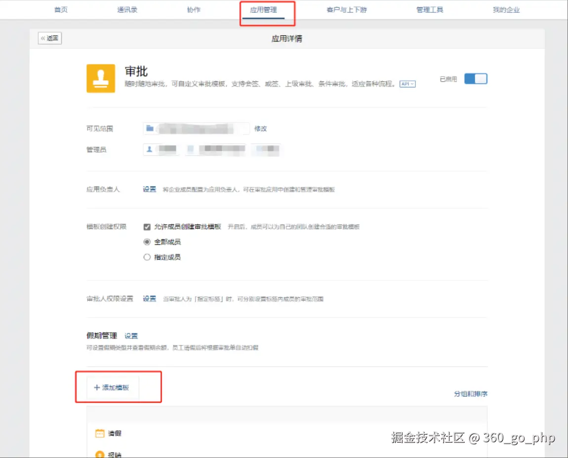 在“应用管理”中,找到需要使用审批功能的应用,并确保它已被授予审批API的访问权限。根据需要创建审批模板,配置审批流程。