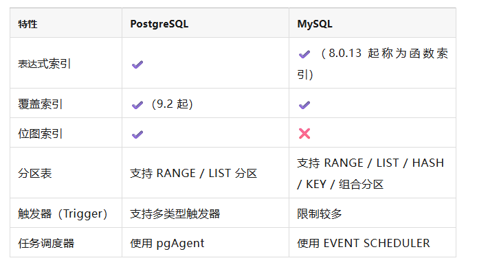 下面我们从多个维度对 PostgreSQL 16.x 与 MySQL 8.x 进行对比: 1)核心功能 2)查询能力 3)索引与性能 4)连接与并发 该文章在 2025/7/15 12:13:34 编辑过 |