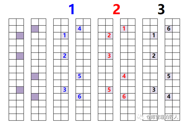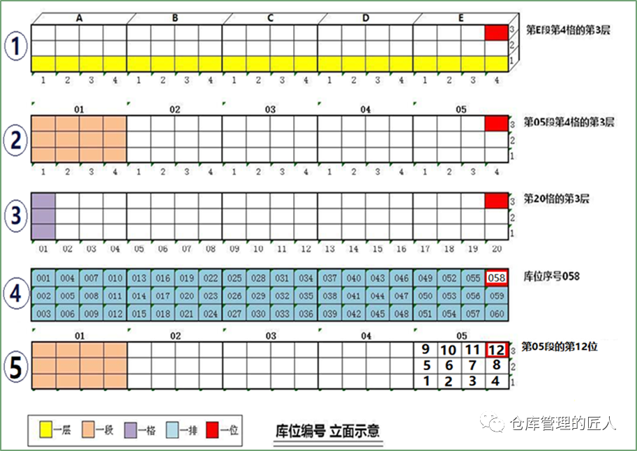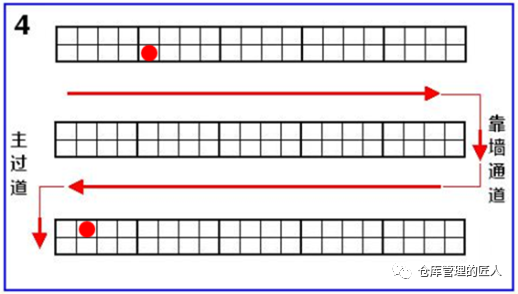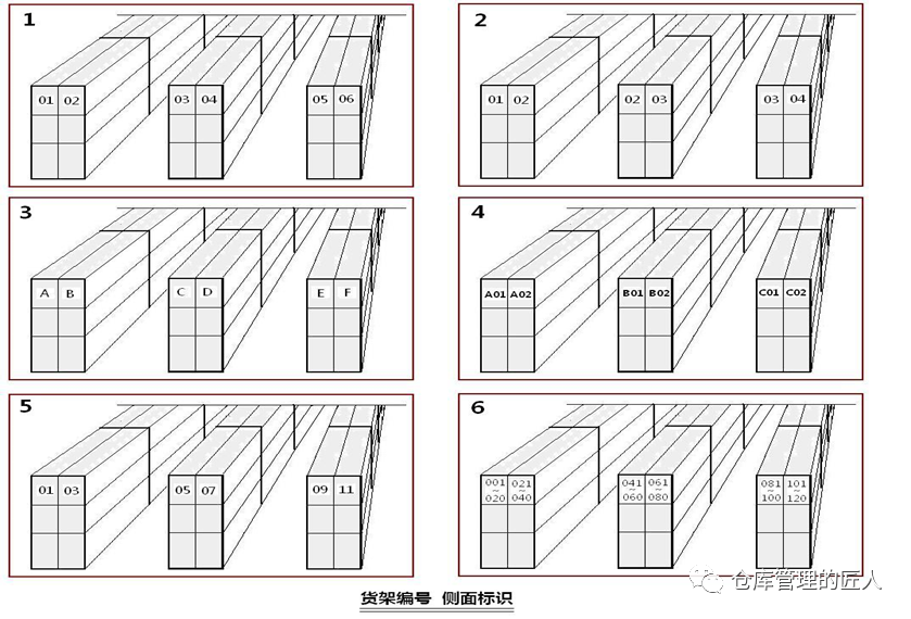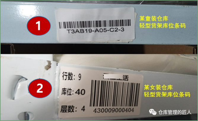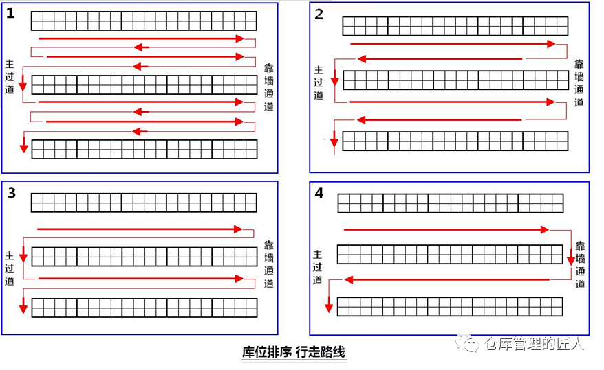 2.5 存储位(以存储平时配货动不到的货品为主)、拣货位(平时拣货,配货优先,方便取货的库位) 2.6 A类库位(取货放货非常方便的库位)、B类库位(取货放货方便度一般)、C类库位(取货放货方便最差的库位)我们在维护库位信息数据库的时候,下面这些信息尽量维护齐全:1.地区;2.楼栋;3.楼层;4.区域;5.移动/固定;6.巷道;7.排;8.组;9.格;10.层;11.长/宽;12.高;13.进深;14.承重;15.可用高度;16.可用容积;17.温度区间;18.离地高度;19.离主通道距离;20.取货便利性;21.存货SKU限制;22.是否限定品类;23.拆分库位数;24.上级库位;25.库位序号/简码;26.库位的中文全称;27.上架优先顺序;28.拣货优先顺序等。我们可以根据这些信息来判断、分析,哪些库位取放货方便,哪些库位适合存储什么货品;哪些库位先当先用,哪些库位后用;哪些库位适合什么季度使用等。我们先来看个示意图,同样的货架,同样的一个位置,但在不同的仓库,却有着不同的编码规则。不同的企业仓库库位编码有着不同的方法,没有社会标准,也没有行业标准,大家都认为适合自己的就好。事实上大企业与小企业,大仓库与小仓库,几十个仓库与只有一个仓库,库位编码的规则确实是不一样的。有的时候我们的库位编码,需要体现:地区码、仓库码、区域码、排号(或巷道号)、组号、格号、层号,但有的时候不需要。比如说有些仓库较小,整个仓库也就500个库位左右,那我们就可以直接用A001到A500就可以,不需要在库位编码上体现什么区域,什么排,什么格,哪一层,只需要在库位基础信息数据库中体现。这里的“A”可以是仓库的代码,也可以是区域的代码。如果仓库较多,库区面积较大,且库位较多,库位又分为不同的库区和类型,达到数万,那么我们就要体现区域和排号,以及组号,层号。无论编码是什么规则,总而言之,字段上最好不要超过10位数,中间的杠最好不要超过3个。对于全国性的仓库编码,库位编码中间的杠也尽量不要超过4个,且库位标识上该放大的信息要放大。现实中,我们最怕的就是教条化,不能灵活变通。无论什么仓库,我们在做库位编码的时候,尽量考虑以下几点:比如说:员工面对一组货架的时候,左边是小号,右边是大号,下面是小号,上面是大号,那么整个公司所有仓库,都尽量是这个原则,因为员工时间长了会形成习惯,如果库位排序规则不一样就会影响判断,甚至出错。也就是说,如果增加或减少(货架)库位,那么新增的库位编码会不会带来什么影响。如果因为到货量增加或减少,现有库位需要组合成大库位,要拆分成小库位,好不好办。D).员工不需要看的信息,意义不大的信息尽量不要体现在库位编码字段上。我们在库位编码和库位标签打印的时候,要尽量避免类似下面这两种情况:上图中第1种情况存在问题是库位编码显得复杂,字段较多,同时在打印的时候不显目,条码也小,不方便扫描;上图中第2种情况是库位编码字段当中没有用杠“—”区分,字数多,容易让人看花眼,好在打印标识的时候,在左边加上了中文注明。由于我们平时在仓库中配货是根据库位的排序进行拣货,那不同的库位编码规则就会有不同的库位排序。如果编库位的时候,是以排为单位,大多会出现下面的路线1;以巷道为单位,“左单右双”编库位,大多会出下面的路线2;有的仓库同一巷道是按U字形顺序编排库位,就会形成下面的路线3。总的来说,第2种路线相对会好一些。但需要注意的是,电商仓库与非电商仓库(如传统制造业、2B仓库)在编排库位时要求并不一样。虽然库位排序路径可能最短,但实际上个别库位拣货与大多库位拣货产生的路径是不一样的。可能看完上图,很多人都会认为第4种路线编排库位是最好的,但并不是,为什么呢?如果不是每个库位都需要拣货,那么人员在拣货时,走的路径就比较灵活。如下图:因为如果需要拣货的只有红色标注的这2个库位,请问我们还需要按箭头显示的路线行走吗?肯定不需要。所以只有在一个巷道大多库位需要拣货时,我们这样的设计才是最好的,否则就不一定好。当然,第1种路线肯定不好,但实际上很多企业只要是以排为单位编库位就是第1种行走路线。总的来说,库位设计,按第3种路线是相对较好的一种!如果我们一组货架或一个库位,只存储一种货品,我们可以称这组货架或这个库位为“A001”,但如果这组货架或这个库位放了多种货品,那我们就可以将这组货架各个货品的库位取名为:A001-1,A001-2,A001-3……至于我们将一个单位空间,划分为几个库位,是由存储多少种货品而定:说明:标签上的35可以代表B区第35个库位,以方便人员识别;不同的颜色有助于区别代码含义;文字描述可以方便新人,非仓库人员理解;注明离地高度,可以知道这个库位是不是方便取货;标有箭头是防止人员识别错误。