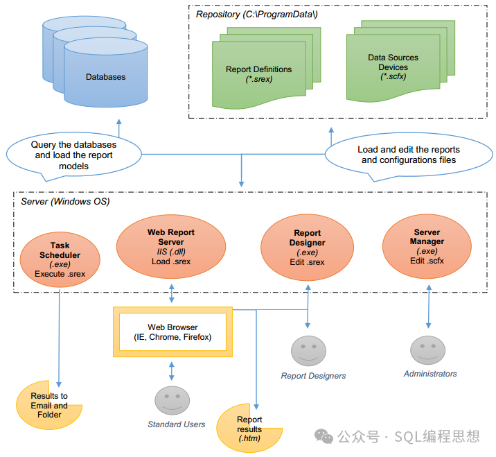 - • 服务管理器(Server Manager)承担报表的集中管理、调度执行、安全控制、外部集成等关键任务。