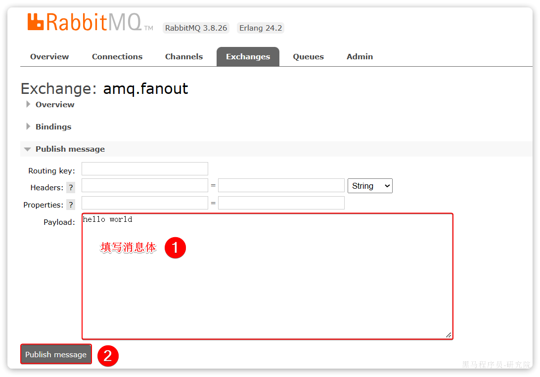点击任意交换机,即可进入交换机详情页面。仍然会利用控制台中的publish message 发送一条消息: