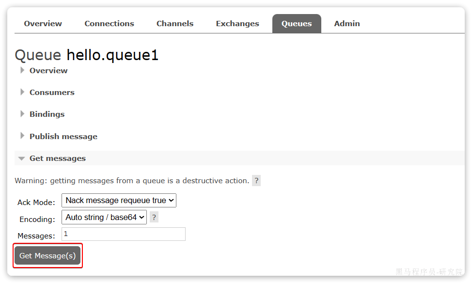 点击队列名称,进入详情页,查看队列详情,这次我们点击get message: