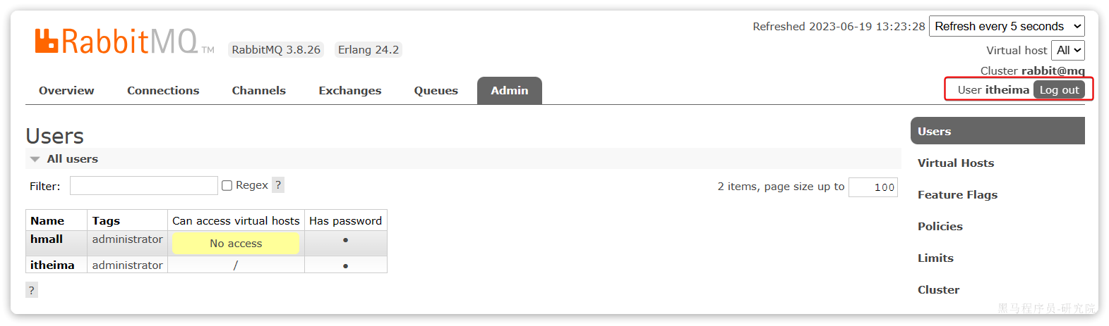 这里的用户都是RabbitMQ的管理或运维人员。目前只有安装RabbitMQ时添加的itheima
