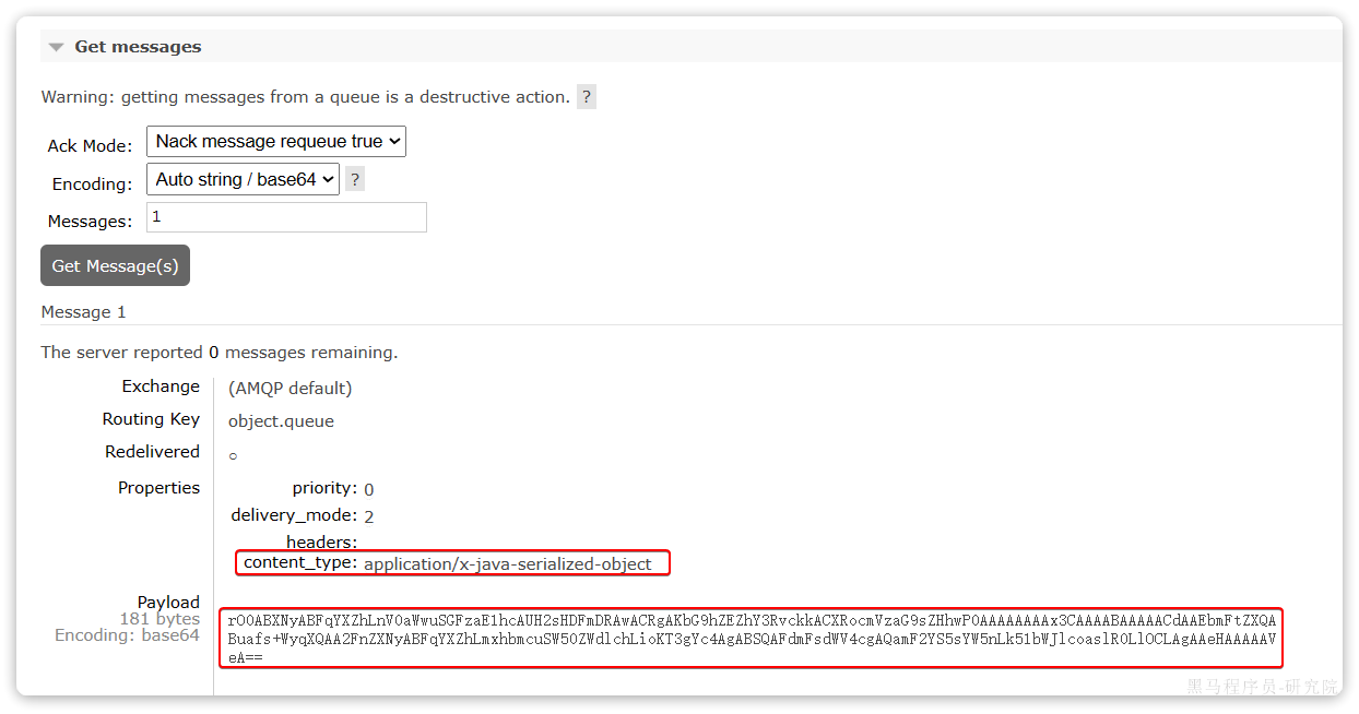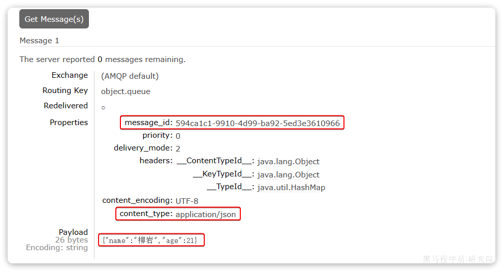 中的旧的消息。然后再次执行刚才的消息发送的代码,到MQ的控制台查看消息结构: