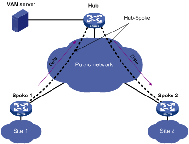 DVPN简介越来越多的企业希望利用公共网络组建VPN(Virtual Private Network,虚拟私有网络),连接地理位置不同的多个分支机构。然而,企业分支机构通常采用动态地址接入公共网络,通信一方无法事先知道对端的公网地址,这就为组建VPN提出了一个难题。 DVPN(Dynamic Virtual Private Network,动态虚拟私有网络)通过VAM(VPN Address Management,VPN地址管理)协议收集、维护和分发动态变化的公网地址等信息,解决了无法事先获得通信对端公网地址的问题。DVPN可以在企业网各分支机构使用动态地址接入公网的情况下,在各分支机构间建立VPN。 DVPN把连接到公网上的各节点组成的网络看作VPN网络,公网作为VPN网络的链路层,DVPN隧道作为企业内部子网之间的虚通道,相当于网络层。企业各分支设备动态接入到公网中,其公网地址对于通信的另一端来说是未知的,而对于建立端到端的安全隧道,公网地址是必须的条件之一。DVPN通过VAM获取通信对端的公网地址。 VAM协议是DVPN方案的主要协议,负责收集、维护、分发公网地址等信息,帮助用户快捷、方便的建立起内部的安全隧道。企业内部子网之间转发的数据报文通过路由协议得到其私网下一跳,通过VAM协议查询到私网下一跳对应的公网地址,并利用该公网地址做为隧道的目的地址进行封装,最后交给已建立起的安全隧道发送到目的端用户。 DVPN的基本概念DVPN方案中有几个关键的角色: 1. DVPN节点 DVPN节点为动态VPN隧道两端的设备,可以是网络设备或主机。DVPN节点参与隧道的建立,需要实现VAM的客户端功能。 2. VAM ServerVAM Server是接受DVPN节点向其注册信息的服务器,负责管理、维护各DVPN节点的信息。目前VAM Server一般运行在较高性能的路由器设备上。 3. VAM ClientVAM Client向VAM Server注册自己的私网地址、公网地址、VAM标识等信息,向VAM Server查询其它VAM Client的信息。DVPN节点上需要实现VAM Client功能。文中涉及到VAM Client的地方,如果不是特别说明,是指对Hub和Spoke的统称。 4. HubHub是一种VAM Client,一个VPN网络的中心设备,它是路由信息交换的中心。在Hub-Spoke组网中,它也是数据转发的中心。 5. SpokeSpoke是一种VAM Client,通常是企业分支机构的网关设备,该节点不会转发收到的其它DVPN节点的数据。 6. AAA服务器AAA(Authentication, Authorization and Accounting,认证、授权和计费)服务器,用于对用户进行认证和计费管理。 DVPN的基本原理DVPN采用Client/Server模式,工作在TCP/IP协议栈的应用层,使用UDP作为传输协议。按照工作方式的不同,可将一个VPN域中的设备划分为一个Server和多个Client,Server的公网地址为静态地址,Client的公网地址既可以静态配置也可以动态获取,而Client的私网地址则需要按照规划静态分配。在同一个VPN域内,要求所有节点的私网地址在同一个网段内。 每一个Client向Server注册自己的公网地址和私网地址的对应关系。Client向Server注册成功之后,其他Client可以从Server查询到该Client的公网地址,以便在Client之间建立DVPN隧道。Server与Client间通过VAM协议进行消息传递,Client之间通过DVPN隧道协议进行隧道的建立、维护和删除。任何节点退出或加入VPN都能自动通知Server。 DVPN的组网结构DVPN具有两种典型的组网结构: