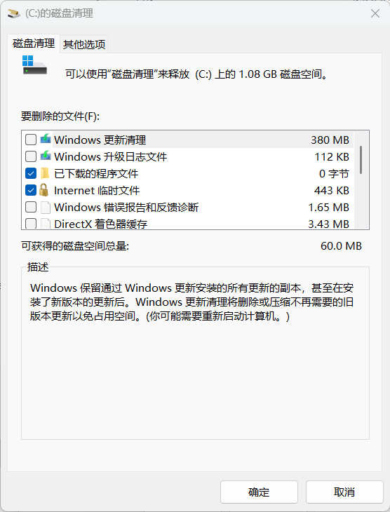 后来笔者发现,上述命令的执行效果实际上和 Windows 自带磁盘清理程序内的“Windows 更新清理”差不多,在执行命令之前,Windows 自带磁盘清理程序的画面是下面这样的: