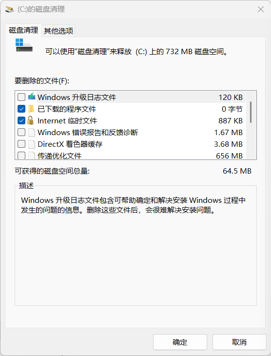 在执行清理命令之后(不是在Windows 磁盘清理程序里面执行,而是使用上面的DISM工具),“Windows 更新清理”项目不见了,表示该项目已经通过上述命令清理了,如下图:
