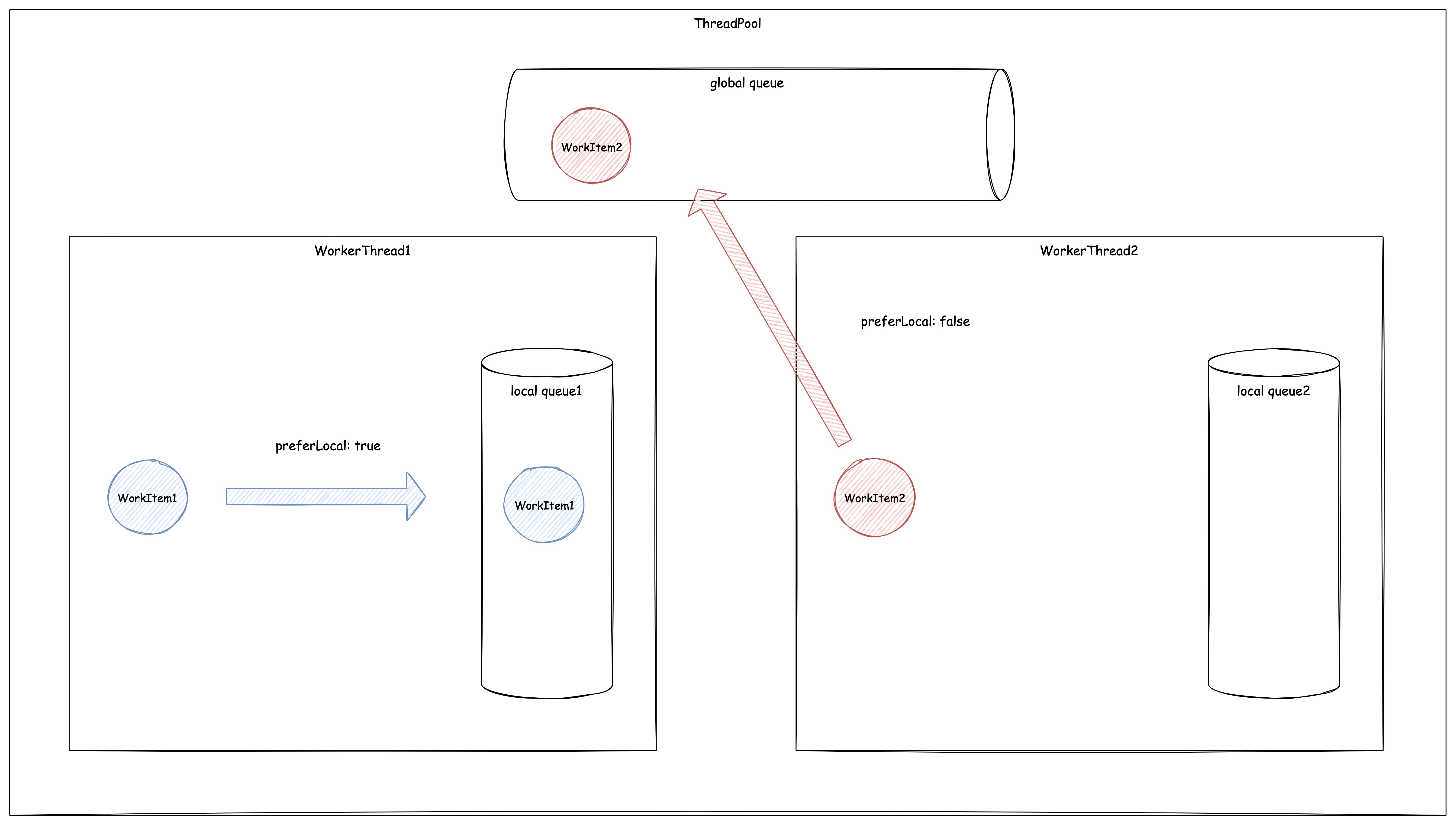 代码的线程正好是个线程池里的某个线程,则该任务就会进入该线程的本地队列中。除此之外的情况则会被放到全局队列中等待未来被某个 Worker Thread 捡走。