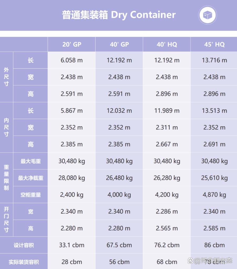 1.干货集装箱 ![]() 干货集装箱(Dry Container)是最常见的普通集装箱,是绝大部分行业使用的集装箱。但凡是没有特殊运输要求的杂货、普货都会用干货集装箱装运。 普柜有四种尺寸,具体尺寸信息见下图。其中最有代表的两个尺寸是 20′ GP 和 40′ HQ,也就是外贸行业中常说的 20 尺小柜和 40 尺高柜。 ![]() 2.冷藏集装箱 ![]() 冷藏集装箱(Reefer Container)是一种专门设计用于运输需要保持特定温度的货物的集装箱。它配有制冷和控温系统,可根据货物的需求进行温度调节(-30 ℃到 30 ℃)。冷藏集装箱的电力依赖船舶和拖车的电力系统。 冷藏集装箱主要运用于以下行业: 食品行业:新鲜农产品、冷冻肉类、海鲜、乳制品、饮料、酒水等。 药品行业:疫苗、药物、生物制品、诊断试剂等。 化学行业:需要稳定低温保存的化学物质。 ![]() 货物的冷藏包装状态决定了装柜方式。 如果货物提前冷冻保存,那么货物可以像普货一样密集堆积在集装箱中。这样阻隔空气流动,可以尽可能让货物保持在低温状态。 如果货物不是提前冷冻状态,那么货物装运在集装箱中,需要每一层、每一列交错摆放并且留下空隙。冷藏集装箱内部冷空气在货物之间流动,以此达到保持温度的作用。 3.开顶集装箱 ![]() 开顶集装箱(Open Top Container)是没有固定顶部的集装箱,用于装载超高或装卸不便的货物,如大型、笨重或超高的物品,如机械设备、钢材、木材等。 因为开顶集装箱没有顶部,所以顶部通常用可拆卸的防水篷布覆盖,以保护货物免受风雨影响。 货物可以通过起重机或吊车从开顶集装箱上方装卸,适合那些无法通过常规集装箱门装入的超高或超重货物。开顶不意味着货物可以超高装载,货物一定要在集装箱限高内,不能影响顶部防水蓬平铺。 4.框架集装箱 ![]() 框架集装箱(Flat Rack Container)通常只有底部和两端的支撑结构,没有侧板和顶板。这种开放设计允许装载和卸载大型或超高货物,适合需要起重机吊装的货物。和开顶集装箱一样,其顶部和侧面需要用防水蓬覆盖保护。 框架集装箱主要应用如下: 超长、超宽货物:如大型管道、钢结构。 大型设备和机械:如建筑机械、矿山设备。 车辆及其他运输工具:如卡车、巴士、船只等。 ![]() 5.通风集装箱 ![]() 通风集装箱 (Ventilated Container) 是指配装通风功能的集装箱。这种集装箱一般用来运输需要保持通风的产品,比如咖啡豆、可可豆等水分较高的产品。 通风系统可以有效防止集装箱内部存水、发霉从而污染货物。其尺寸和干箱一致,这里不再赘述。 6.挂衣集装箱 ![]() 挂衣集装箱(Garmentainer)是一种专门用于运输特殊服装的集装箱。集装箱中配备了挂衣杆,能够让服装在运输过程中悬挂而不是折叠,保持衣物平整。 这种设计使得挂衣集装箱非常适合运输高端成衣、西服、戏服、礼服、婚纱以及其他对外观要求较高的服装产品。有些挂衣集装箱配有通风装置,确保服装在运输过程中保持干燥,避免因湿气导致的霉变或损坏。 挂衣集装箱的主要有 20 尺、40 尺 GP、40 尺 HQ,其外部、内部尺寸和干箱一致,这里不再赘述。 7.罐式集装箱 ![]() 罐式集装箱(Tank Container),又称为液体罐集装箱或 ISO 罐式集装箱,是一种专门用于运输液体、气体和化学品的集装箱。它由一个不锈钢罐体和一个保护罐体的钢制框架组成,具有耐腐蚀性和密封性,适合运输各类液体物质。包括食品级液体、化学品和危险品。 罐式集装箱的主要应用如下: 化学品运输:大量危险品和非危险品化学液体(如酸、碱、溶剂等)通过罐装集装箱运输,确保安全与环保。 食品级液体运输:食品级液体(如酒类、牛奶、果汁、食用油等)在运输过程中对卫生和安全有较高要求,罐装集装箱内部经过特殊处理,确保无污染。 石油和燃料运输:液态燃料、润滑油等易燃液体常用罐装集装箱进行长途运输,避免泄漏和危险。 气体运输:一些经过液化处理的气体(如液态天然气、液态氧、液态氮等)也可以通过特殊设计的罐装集装箱进行运输。 制药和化妆品行业:药用液体和化妆品原材料液体需要高卫生标准,罐装集装箱为其提供了安全卫生的运输环境。 ![]() 阅读原文:点击这里 该文章在 2025/8/9 12:28:25 编辑过 |