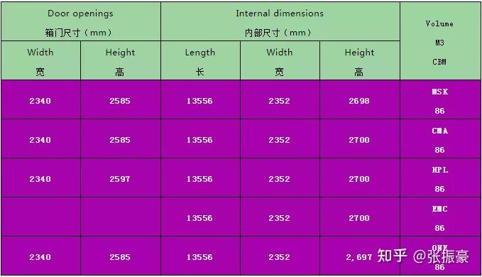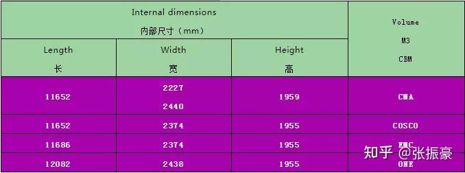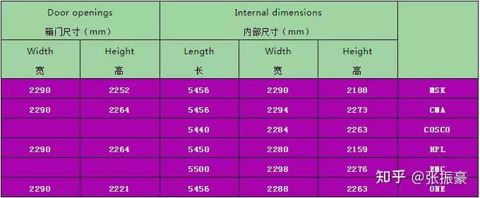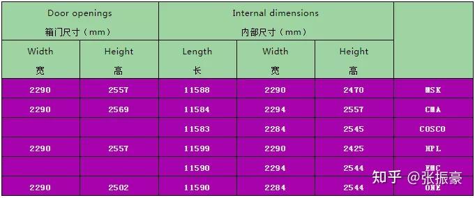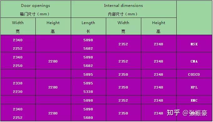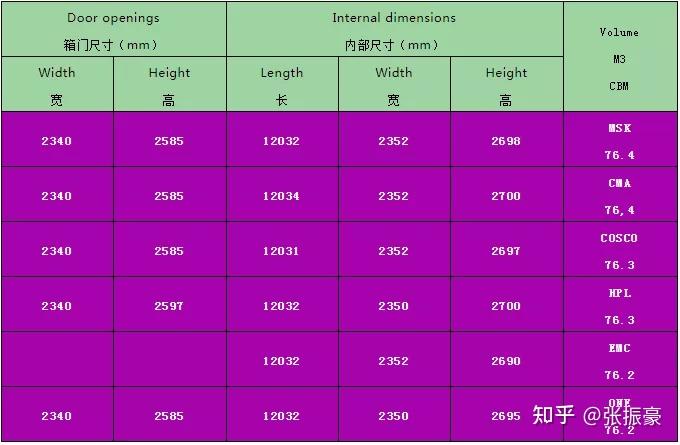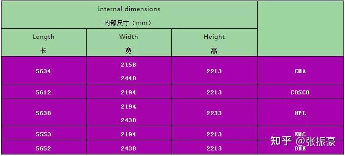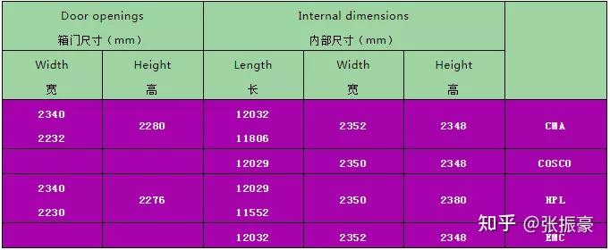 怎么计算装货量,装什么箱型,离不开最基本的一个数据,那就是集装箱的尺寸。 谈到集装箱尺寸,我们熟知小箱长度大概5.9米,自然而然很多人会以为大箱长度就是11.8米。 其实这种意识的长度是不准确的,大箱长度也不是小箱长度乘以2,那么集装箱尺寸到底是多少呢? 下面我们来详细说明。 关于集装箱尺寸,包含三个部分:外部尺寸、内部尺寸、箱门尺寸。 外部尺寸我们这里不做介绍,只要知道内部尺寸和箱门尺寸,我们用着就会得心应手! 干货箱(Dry Cargo) 1、20英尺普箱,表示为:20GP/20FCL/20SD/20DV/20DC/20DRY8.6 2、20英尺高箱,表示为:20HQ/20HC 3、40英尺普箱,表示为:40GP/40FCL/40SD/40DV/40DC/40DRY8.6 4、40英尺高箱,表示为:40HQ/40HC/40DRY9.6 5、45英尺高箱,表示为:45HQ/45HC 冷藏箱(Refrigerated Cargo) 1、20英尺冷箱,表示为:20RF 2、40英尺高冷箱,表示为:40RH 开顶箱(Open Top) 1、20英尺开顶箱,表示为20OT 2、40英尺开顶箱,表示为40OT 3、40英尺高开顶箱,表示为40OH 框架箱(Flat Rack) 1、20英尺框架箱,表示为20FR/20FL 2、40英尺框架箱,表示为40FR/40FL 3、40英尺高框架箱,表示为40FR High 该文章在 2025/8/9 13:20:03 编辑过 |
