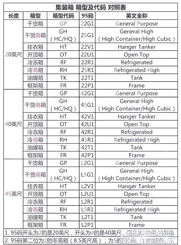 1)干货箱:其箱型代码为GP,95码为22G1。