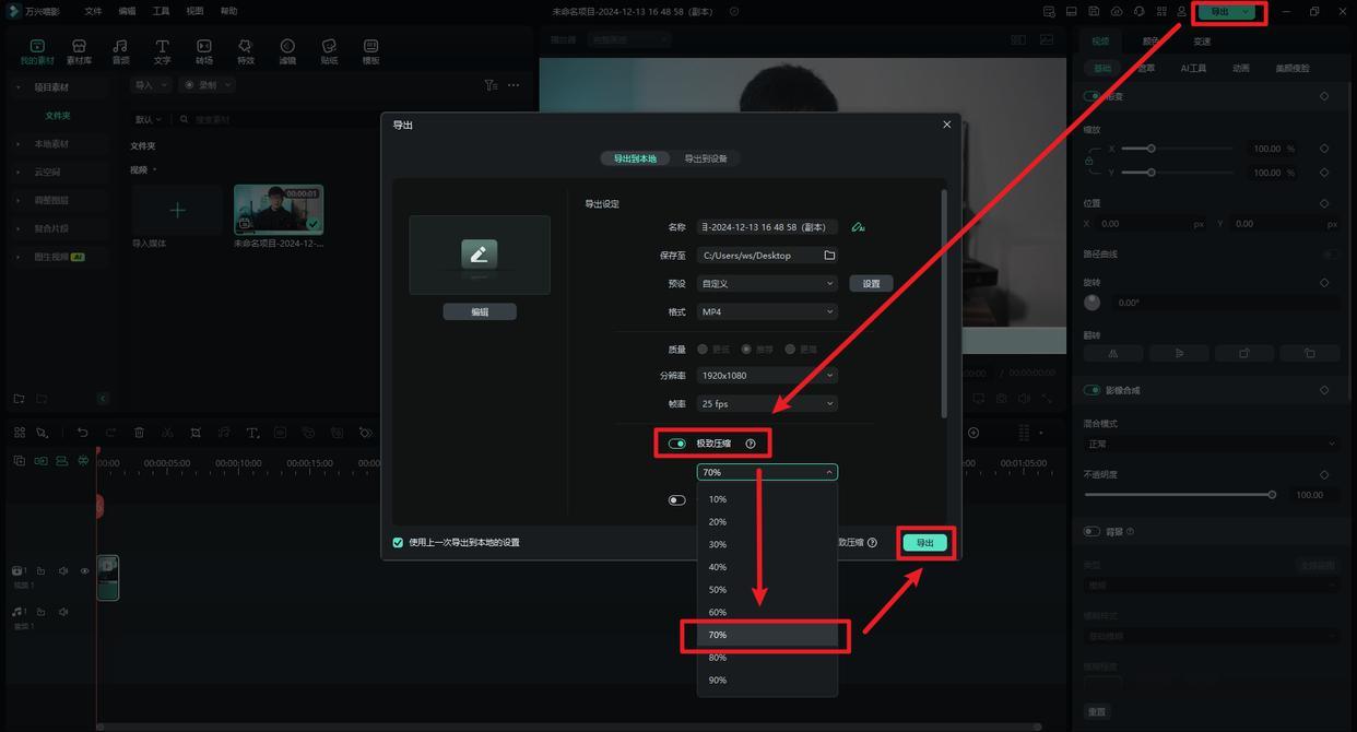 ②点击【极致压缩】,选择压缩的比例。万兴喵影可以做到大幅度压缩视频大小,但是又几乎不损失画质。