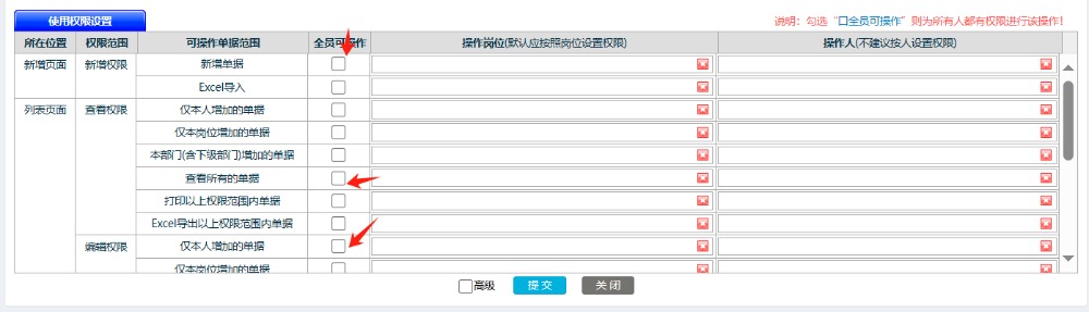 ![]() 在页面设计最下方,有用户权限分配的勾选项,一般新增,查看权限为所有人的,其他都是 本人的单据才允许操作 如下图: ![]() 点晴模切ERP更多信息:http://moqie.clicksun.cn,联系电话:4001861886 该文章在 2025/8/13 10:35:46 编辑过 |