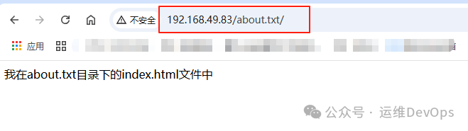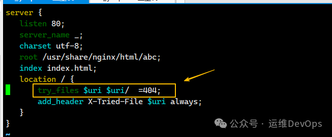 上述配置理解为:如果默认情况下什么路由都不加,那么请求到abc/index.html,如果请求的时候加了一个路由,比如 “ip/about.txt”,那么首先会查找abc路径下是否有about.txt文件,此时about.txt对应的就是"$uri",如果没有找到about.txt,那么继续查找abc路径下是否有about.txt目录,这个about.txt目录对应的就是”$uri/” ,如果有,那么就请求about.txt目录的内容,如果也没有这个目录,那么就返回默认的页面,也就是最开始的abc/index.html注:找about.txt目录下的文件默认也是index.html(1)、如果什么路径都不加,直接使用IP访问,默认会找到abc下的index.html,如图:(2)、在abc目录下定义about.txt目录,在此目录下定义index.html文件,写入内容,通过ip/about.txt访问,如图:注:因为abc目录下没有about.txt文件,但是有about.txt目录,因此跳过$uri,继续找$uri/,找到了并返回结果(3)、在abc目录下定义test.txt文件,写入内容,此时通过ip/test.txt访问,如图:此时符合了第一个$uri,因此不会继续向后面查找了(4)、直接通过ip请求未知的资源路径,ip/gong.doc,回到了默认页面,如图:因为abc路径下不存在gong.doc也不存在这个目录,因此就会找到最终的/index.html2、检查静态文件是否存在,不存在则转发到后端应用,源nginx的配置,如图:上图中的配置可以理解为如果请求的路由不匹配$uri和$uri/,那么会转发到@backend的后端服务,这个backend名称是自定义的,因此如果请求http://192.168.49.83/test_route的时候,但是本地没有对应的匹配,因此会转发到http://192.168.49.224/test_route,这个test_route会带到后端去的(1)、修改49.224的nginx配置文件,添加内容如图:注:在后端的nginx配置中,也要有这个test_route路由,否则会报404错误(2)、在/data/html目录下新建test_route目录并定义index.html文件,如图:(3)、此时通过源IP来请求test_route路由,因为当前没有匹配,就会跳转到后端服务去,如图:add_header X-Tried-File $uri always;