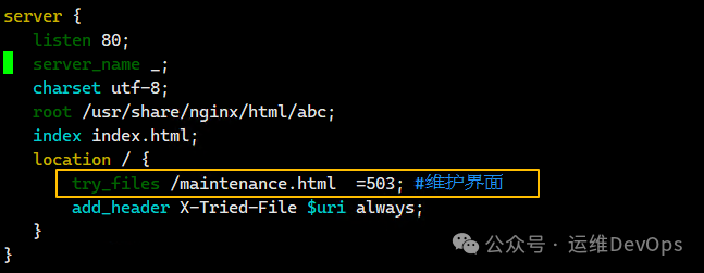 变量),查看响应头信息,可以看到X-Tried-File,如图:3、检查静态文件是否存在,不存在直接返回404,如图:请求gong.txt,既不存在此文件也不存在此目录,因此直接返回404,如图:4、访问页面,直接返回状态码,适合维护页面,如图:在abc目录下定义maintenace.html(名字要与nginx配置名字一致),然后通过192.168.49.83请求,如图:上面配置理解为:如果请求/hello,那么匹配/custom/hello,如果匹配不到就继续匹配/default/hello,如果都匹配不到就返回404(1)、在abc目录下新建custom目录并在内部创建gong.txt文件,新建default目录并在内部新建guan.txt,通过url请求,如图: