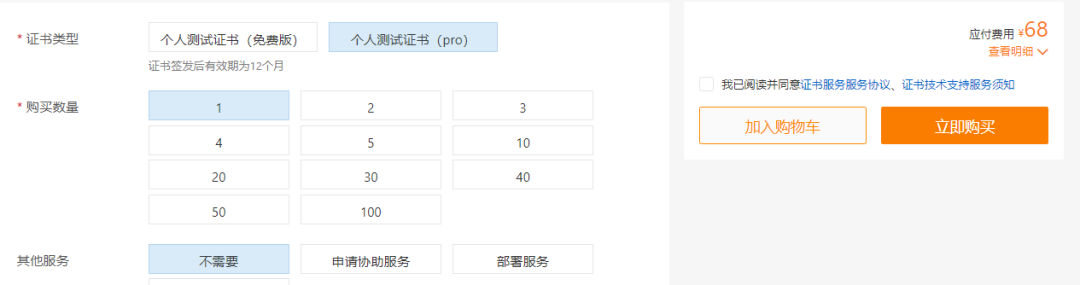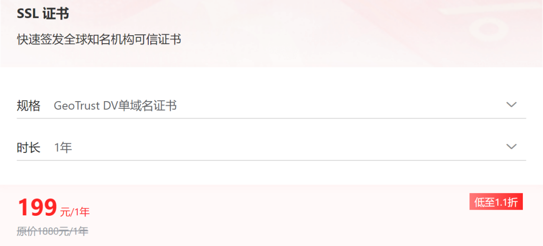 如果你不想使用免费的,但是预算有限,不妨试试这几款,价格都是从几十元到三五百块。阿里云之前介绍过,最便宜的个人版Pro数字证书地址68元1年,其次就是高性价比的DV型270.30元1年,这个价格还是很划算的了。68元1年的在SSL控制台选择个人测试证书(原免费证书)购买,选择个人测试证书(pro)。地址:https://t.aliyun.com/U/LGZcAR地址:https://curl.qcloud.com/VKvvWLja京东云的GeoTrust DV单域名证书价格199 元/1年,低至1.1折,性价比很高,个人站点或者是小程序APP部署HPPTS都是非常合适的。