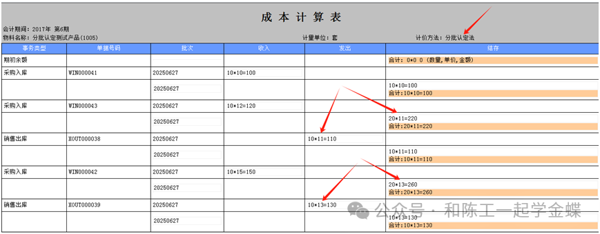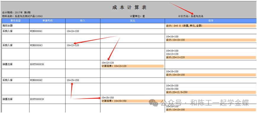 金蝶有5种出库成本的计价方法,各是什么意思,核算出来的出库成本为什么不一样呢,今天就让我给大家详细介绍一下它们之间的区别和成本是怎么核算出来的。 一,先介绍一下每种成本计价方法的具体意义: 1.先进先出法:先购入的材料先发出,并按照单据的先后日期来计算出库成本的计价方法 2.后进先出法:后购入的材料先发出,并按照入库单据的最近日期来计算本次出库的成本,这里的“后”指本次出库之前的最后一次入库。 3.加权平均法:根据月初结存材料和全月收入材料的数量和金额,于月末一次计算出以数量为权数的全月加权平均单价作为本月发出材料的单价,以求得本月发出材料成本的一种方法,加权平均法又称为全月一次加权平均法。 4.移动平均法:根据月初结存与这次出库单据日期前所有的入库的数量和金额,计算出以数量为权数的移动加权平均单价,作为其后发出材料的单价,只要每出库一次,那么就按这个日期前的单据进行加权平均,相当于一个月出库多少次就会平均多少次,也称多次加权平均法。 5.分批认定法:以原来每批入库时材料时的单价作为每批发出材料的单价,以求得各批次发出材料成本的一种方法,每个批次单独进行加权平均法 二.以具体实例来详细介绍不同计价方法具体的取数逻辑和计算方式和结果 假如有以下业务流程,有多次出入库的单据:6.1,6.2和6.10各做了三张采购入库单,而6.5及6.15号各做了两张销售出库单,月初没有数量,当月进行了三次入库和两次出库,入库单价各不一样,且出入库均为同一产品且属同一批次,使用不同的计价方法计算出该商品两次出库的成本: