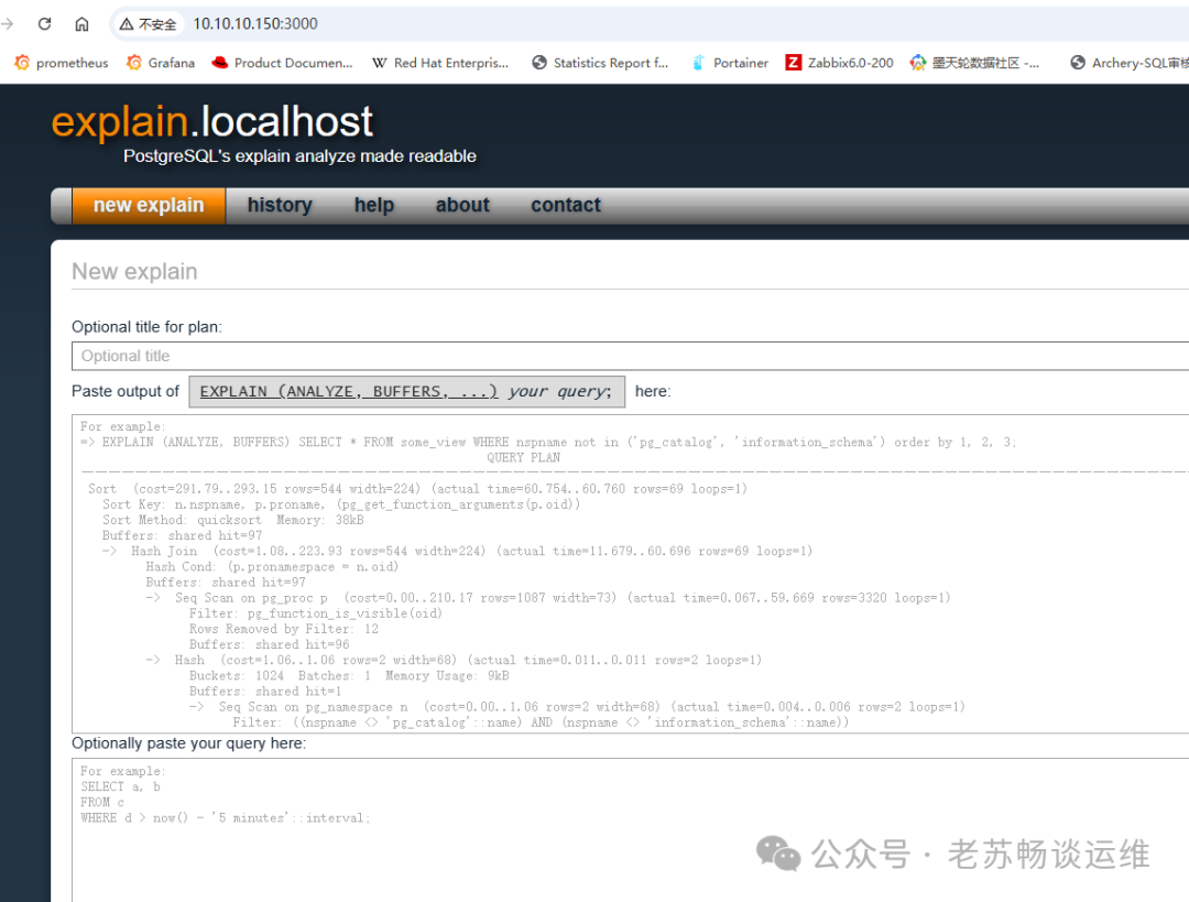 前言使用过Oracle的SQL Monitor的朋友都知道,它能够将复杂的SQL执行计划解析为直观的HTML可视化报告。清晰展示查询的执行路径、耗时分布及资源消耗,帮助开发者快速定位性能瓶颈,如表扫描、索引缺失、JOIN效率等问题。对于诊断慢SQL,该工具提供分析支持,大幅提升数据库调优效率。那对于PostgreSQL数据库,有没有类似的工具可以用来分析呢?答案是肯定的,那就是Depesz EXPLAIN ANALYZE visualizer,我们看一下它的使用方法。 在线访问方式可以直接访问:https://explain.depesz.com/ ![]() 本地搭建方式当然除了在线访问,你可以本地部署,以下是本地部署步骤。 安装Docker环境(此处略过Docker安装步骤) 克隆项目源码git clone https://gitlab.com/depesz/explain.depesz.com.git 拉起镜像进入项目docker目录并启动容器: cd docker/ 若出现镜像拉取超时: # docker-compose up --build 解决方案:更换Docker镜像源 编辑配置文件: cat /etc/docker/daemon.json 内容如下: { 重启Docker服务: systemctl daemon-reload && systemctl restart docker 验证部署查看运行中的容器: docker ps 正常输出示例: CONTAINER ID IMAGE PORTS NAMES 若服务卡住,可尝试: docker-compose start 访问服务成功启动后访问: http://[你的服务器IP]:3000 ![]() 使用方法使用方法简单:第一个标题随便输入,第二个空栏贴上您的执行计划,接着点提交,即可基于当前的执行计划生成一份HTML的报告。 ![]() ![]() 用红色背景高亮显示,是我们的重点观察对象。 最后的stats列是SQL的总览信息 转自:https://mp.weixin.qq.com/s/sS8ucKBpzmgt_T85mZW_fQ 该文章在 2025/8/19 10:26:39 编辑过 |