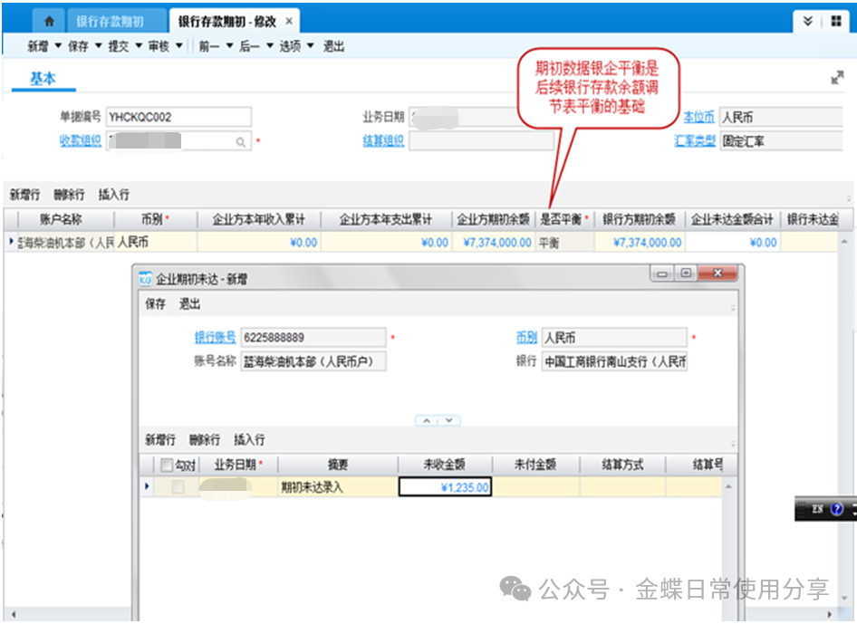 4.1设置系统启用日期【业务场景】:设置出纳管理系统的启用日期。 【用户角色】:出纳 【功能菜单】:【财务会计】—>【出纳管理】—>【初始化】—>【启用日期设置】 【操作说明】:企业根据真实情况选择组织机构启用时间 4.2录入期初单据4.2.1库存现金的期初余额录入【业务场景】:录入库存现金的期初余额 【用户角色】:出纳 【功能菜单】:【财务会计】—>【出纳管理】—>【初始化】—>【现金期初】 【操作说明】:录入库存现金的期初余额 4.2.2银行存款的期初余额录入【业务场景】:录入银行存款的期初余额 【用户角色】:出纳 【功能菜单】:【财务会计】—>【出纳管理】—>【初始化】—>【银行存款期初】 【操作说明】:录入银行存款的期初余额这里需要特别注意,还需要同时录入期初企业未达账和期初银行未达账,保证期初银行存款对账平衡。这些期初未达数据,将参与后续银行存款对账的勾对处理。 4.3结束初始化【业务场景】:出纳管理初始化结束 【用户角色】:出纳 【功能菜单】:【财务会计】—>【出纳管理】—>【初始化】—>【出纳管理结束初始化】,系统结束初始化,正式进入日常业务处理阶段。 【操作说明】:结束初始化工作在第一次结账前进行即可,即录入初始单据和录入第一期单据可以同时进行。