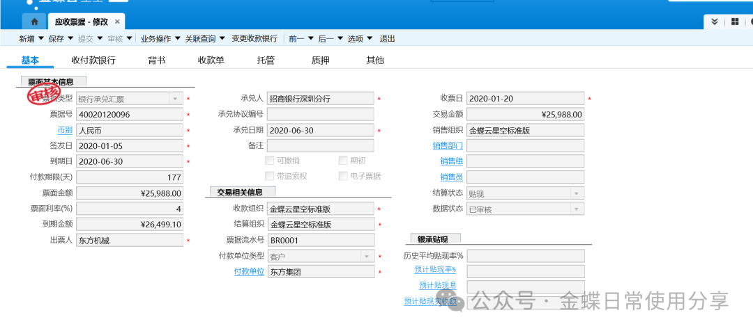 5、日常操作5.1日常存取现以及收付款业务处理:5.1.1现金存取单【业务场景】:处理日常存现、取现业务 【用户角色】:出纳 【功能菜单】:【财务会计】—>【出纳管理】—>【日常处理】—>【现金存取单】。 【操作说明】:企业用户按照业务需求新增现金存取单 5.1.2银行转账单【业务场景】:可处理日常企业内部转账业务,购汇业务也在此处理。 【用户角色】:出纳 【功能菜单】:【财务会计】—>【出纳管理】—>【日常处理】—>【银行转账单】。 【操作说明】:企业用户根据夜壶需求新增银行转账单 5.1.3收款/收款退款【业务场景】:处理所有对外收款业务。 【用户角色】:出纳 【功能菜单】:【财务会计】—>【出纳管理】—>【日常处理】—>【收款单】。 【操作说明】:企业用户根据业务需求新增收款单 【业务场景】:处理收款退款业务 【用户角色】:出纳 【功能菜单】:【财务会计】—>【出纳管理】—>【日常处理】—>【收款退款单】。 【操作说明】:企业用户根据业务需求新增收款退款单 5.1.4付款/付款退款【业务场景】:处理所有对外付款业务 【用户角色】:出纳 【功能菜单】:【财务会计】—>【出纳管理】—>【日常处理】—>【付款单】。 【操作说明】:企业用户根据业务需求新增付款单 【业务场景】:处理付款退款业务 【用户角色】:出纳 【功能菜单】:【财务会计】—>【出纳管理】—>【日常处理】—>【付款退款单】。 【操作说明】:企业用户根据业务需求新增付款退款单 5.1.5应收/应付票据【业务场景】:维护接收的应收票据/应付票据,以及进行应收票据/应付票据的后续结算业务处理。 【用户角色】:出纳 【功能菜单】:【财务会计】—>【出纳管理】—>【日常处理】—>【应收票据】/【应付票据】, 【操作说明】: 企业用户根据真实业务情况对应收/应付票据进行维护接收并进行后续结算业务处理。 5.1.6付款申请单【业务场景】:处理所有付款申请业务 【用户角色】:出纳 【功能菜单】:【财务会计】—>【出纳管理】—>【日常处理】—>【付款申请单】。 【操作说明】:企业用户根据实际业务情况新增付款申请单 5.2应收票据业务处理流程5.2.1应收票据登记【业务场景】:企业用户收到应收票据后系统上操作。 【用户角色】:出纳 【功能菜单】:【财务会计】->【出纳管理】->-【日常处理】->【应收票据】 【操作说明】:新增应收票据根据真实业务情况维护票据内容