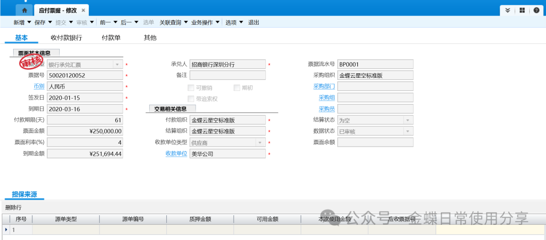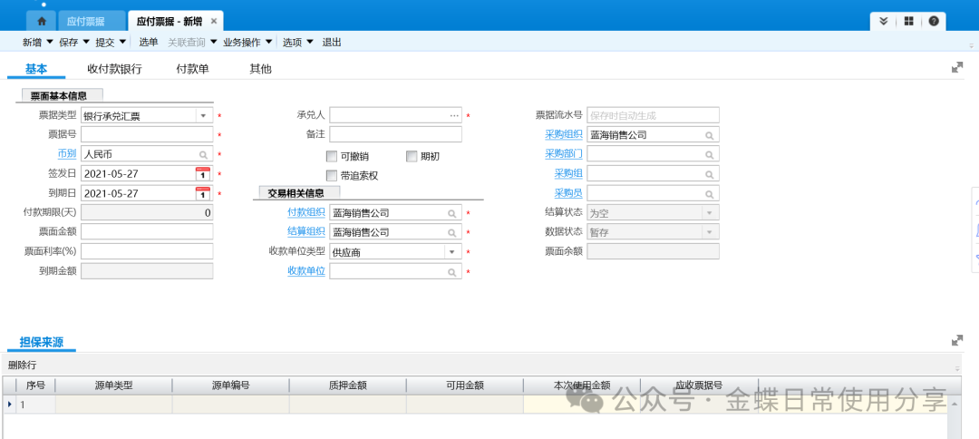 5.3应付票据业务处理流程5.3.1应付票据登记【业务场景】:企业用户收到应付票据后系统上操作。 【用户角色】:出纳 【功能菜单】:【财务会计】->【出纳管理】->-【日常处理】->【应付票据】 【操作说明】:新增应付票据根据真实业务情况维护票据内容
