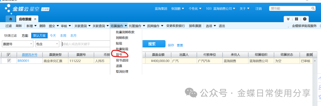 5.2.2应收票据背书【业务场景】:企业用户需要应收票据背书 【用户角色】:出纳 【功能菜单】:【财务会计】->【出纳管理】->-【日常处理】->【应收票据】->【业务操作】->【背书】 【操作说明】:具体操作如下
