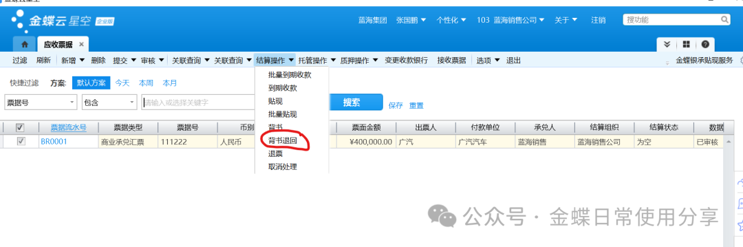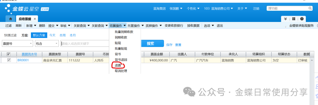 5.2.6应收票据退票【业务场景】:企业用户需要应收票据背书 【用户角色】:出纳 【功能菜单】:【财务会计】->【出纳管理】->-【日常处理】->【应收票据】->【业务操作】->【退票】 【操作说明】:具体操作如下