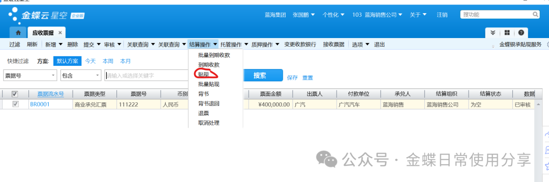 5.2.4应收票据贴现【业务场景】:企业用户需要应收票据背书 【用户角色】:出纳 【功能菜单】:【财务会计】->【出纳管理】->-【日常处理】->【应收票据】->【业务操作】->【贴现】 【操作说明】:具体操作如下
