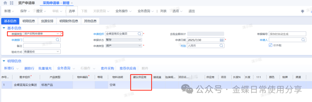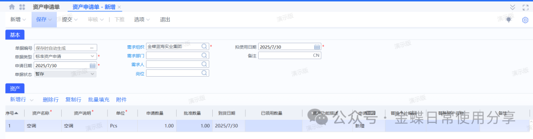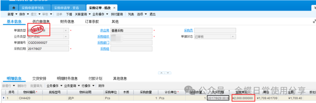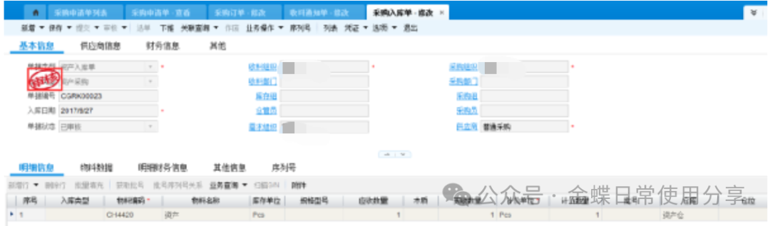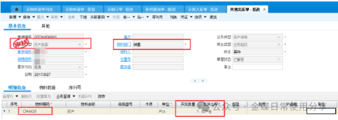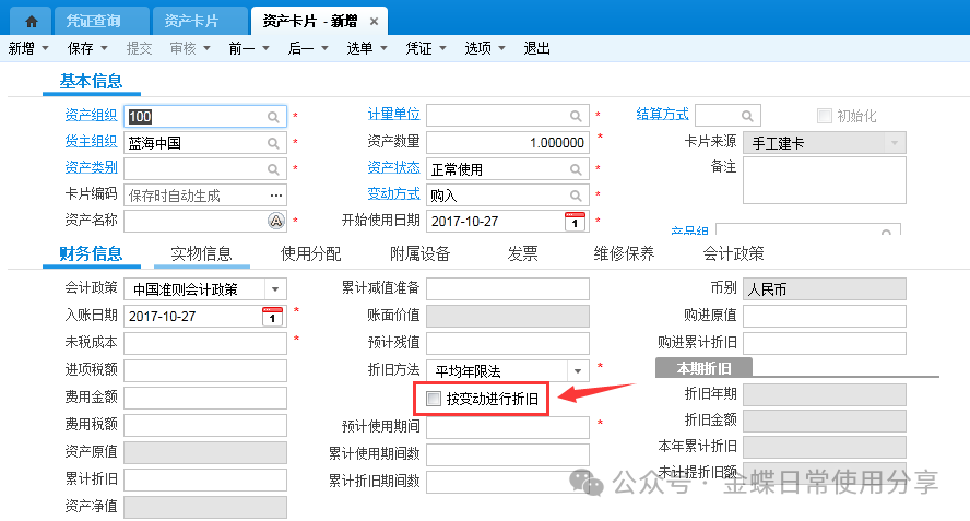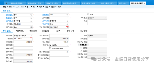 2业务数据2.1创建物料【业务场景】:企业用户资产物料的建立 【用户角色】:管理会计 【功能菜单】:【基础资料】->【主数据】->【物料】 【操作说明】:注:只有物料属性为资产的物料才能做资产申请单。 系统默认资产物料不入库,如果客户实际业务需要入库,那么在新建资产物料时一定要允许库存。 ![]() 2.2 资产申请单(可选)【业务场景】:企业用户新增资产提交申请 【用户角色】:企业用户 【功能菜单】:【资产管理】->【固定资产】->【资产请购】->【资产申请单】 【操作说明】:资产需求采购部门在系统中创建资产申请单,填写需求组织及部门、所需资产物料(物料属性为资产),数量及到货日期并提交审核。 ![]() 2.3采购申请单【业务场景】:企业用户新增资产提交采购申请单 【用户角色】:采购员 【功能菜单】:【采购管理】/【资产管理】->【采购申请-采购申请单】 【操作说明】:当需求人员做了资产申请单的情况下,首先调整采购申请单的单据类型为资产采购申请单,再通过选单的方式创建采购申请单,选择采购组织、录入推荐供应商(可选)提交审核。 ![]() 若需求人员不做资产申请单,可以直接创建采购申请单来达到申请的需要,单据类型为资产采购申请单,手动填写资产申请组织及部门、采购组织、物料、数量、到货日期、及建议供应商(可选)并提交审核。 ![]() 2.4 采购订单【业务场景】:企业用户新增采购订单 【用户角色】:采购员 【功能菜单】:【供应链】->【采购管理】->【采购申请】->【采购申请列表】->【下推采购订单】 【操作说明】:采购员填写单价并提交审核。 ![]() 2.5采购收料【业务场景】:企业用户进行采购收料操作 【用户角色】:采购员 【功能菜单】:【供应链】->【采购管理】->【订单处理】->【采购订单列表-下推操作】 【操作说明】:采购订单下推收料通知单,若实际业务需要入库且该资产物料设置了允许库存,则填写仓库,否则直接提交审核,没有入库动作的直接看2.8。 ![]() 2.6采购入库【业务场景】:企业用户进行采购入库操作 【用户角色】:采购员 【功能菜单】:【供应链】->【采购管理】->【收料处理-收料通知单列表】->【下推操作】 【操作说明】:提交审核 ![]() 2.7资产出库【业务场景】:企业用户需要资产出库 【用户角色】:仓储员 【功能菜单】:产品路径:【供应链】->【库存管理】 ->【杂收杂发】->【其他出库单】 【操作说明】:已入库的资产在领用时需要进行出库处理,新增其他出库单,更改单据类型为资产出库,填写领用部门、物料编码、实发数量、发出仓库等信息并提交审核。 ![]() 2.8资产卡片【业务场景】:企业用户需要新增资产,资产信息以卡片的形式记录 【用户角色】:管理会计 【功能菜单】:【资产管理】->【固定资产】->【日常管理】->【资产卡片】 【操作说明】:新增资产卡片,选择正确的资产组织及货主组织(资产组织和货主组织可以不相同即管理资产的组织与实际所有权所属的资产组织不一致,资产组织必须有资产职能,货主组织可以没有资产职能。),选择资产类型后再点击“选单”关联采购收料单或其他出库单。 ![]() 根据实际需求填写卡片,若一个使用组织使用多个会计政策,则需要在每种政策下,填写财务信息。 字段后有红点的为必录信息,录入后提交审核。 3固定资产日常管理3.1固定资产新增【业务场景】:企业用户需要新增固定资产 【用户角色】:管理会计 【功能菜单】:【资产管理】->【固定资产】->【日常管理】->【资产卡片】 【操作说明】:资产卡片为私有基础资料,按照实际使用组织进行创建 注:按变动进行折旧是不可逆操作,请根据自身情况加以选择。 选定好对应的会计政策,有多个会计政策的组织,每个会计政策下都要录入一遍财务信息。 开始使用日期为实物资产的实际使用日期,建议早于或等于资产的入账日期,该字段为文本字段不参与实物的财务计算,但会影响累计使用时间。 入账日期是固定资产启用期间中的一天 财务信息页签下,各字段所代表的内容及注意点。