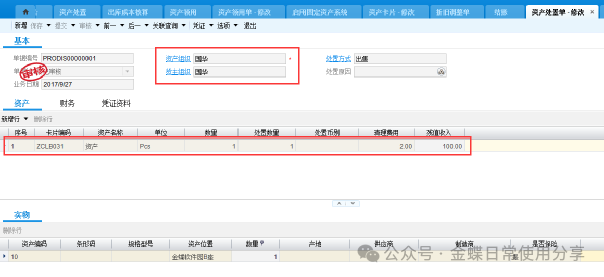 若资产卡片存在一卡多物(同一种物料多数量)的状况,则在实物信息页签中,可以通过资产编码区分不同的实物资产,一般一个资产编码一个实物资产,每个资产编码对应资产位置及数量。 注意:当一张卡片一卡多物的时候,在进行调入等日常管理时,该卡片上的所有东西都要进行该操作,变更频繁的固定资产,不宜一卡多物。 若资产卡片存在一物多分配的情况,则在使用分配页签中,针对资产编码设定分配比例。一个资产编码分配比例加一起应该为100%。 若还有附属设备、发票内容、维修保养需要记录,都可以放在附属设备、发票、维护保养页签中,此处仅作为管理需求存在,不影响财务计算。 3.2固定资产处置【业务场景】:企业用户对资产进行处置 【用户角色】:管理会计 【功能菜单】:【资产管理】->【固定资产】->【日常管理】->【资产处置单】 【操作说明】:当用户需要对固定资产进行出售等处置处理时,新增资产处置单,选择资产组织及货主组织,选择卡片编码,填入所需费用及得到的收入,确定实物分录,并进行提交、审核操作。 注:在做本月资产处置单之前不要做本月的计提折旧。 3.3固定资产变更【业务场景】:企业用户对存在信息变化的固定资产进行变更操作 【用户角色】:管理会计 【功能菜单】:【资产管理】->【固定资产】->【日常管理】->【资产变更单】 【操作说明】:新建资产变更单,首先选择资产组织及货主组织,选择卡片编码(只显示该资产组织及货主组织下的卡片编码,若没有需要的卡片编码,确定组织的正确性)根据实际情况填写变更数据,可变更的内容可详见各页签下信息,并提交审核。