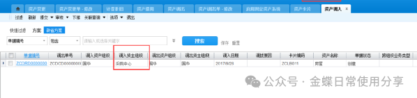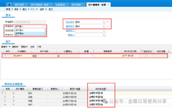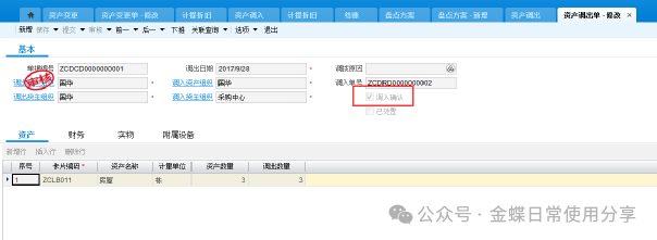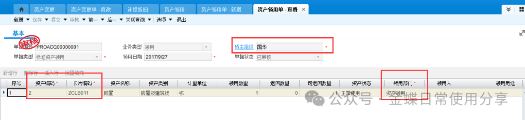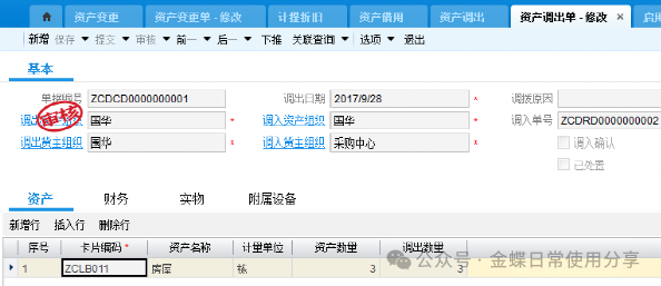 注:当资产做非财务变更不需要做新的折旧计提,当资产财务变更的情况下需要做折旧计提(计提方法看第四章 1.固定资产折旧计提) 变更后资产卡片可以查看变更记录 3.4固定资产领用及借用【业务场景】:企业用户对固定资产进行领用及借用 【用户角色】:管理会计 【功能菜单】:【资产管理】->【固定资产】->【日常管理】->【资产领用】 【操作说明】:这里的固定资产领用及借用指的是资产非财务性质的进行使用部门的变化,若涉及财务物权的转移则使用固定资产挪用。 领用:首先选择货主组织,再选择资产编码,若选不到资产编码,检查货主组织,填写领用数量及领用部门,并提交审核。 产品路径:资产管理-固定资产-日常管理-资产借用 借用:根据此资产是借入还是借出来选择单据类型,选择货主组织及借用组织,选择卡片编码及数量,实物信息位置有改变的进行更改,没有改变的不维护。 因为系统支持一卡多物,实物信息会带出这张卡片上的所有实物,所以如果只借用一张卡片中的一个,请维护你借用的那一个。维护完数据提交审核。 3.5固定资产挪用【业务场景】:固定资产组变更 【用户角色】:管理会计 【功能菜单】:【资产管理】->【固定资产】->【日常管理】->【资产调出】/【资产调入】 【操作说明】:选择调出资产组织及货主组织,调入资产组织及货主组织,填写需要调出的卡片编码,并提交审核 资产调出单审核后,调入货主组织会自动生成一张创建状态的资产调入单 如果在资产调入列表中没有看到单据,查看所在组织是否是调入货主组织,选择单据提交审核。 调入方调入后,系统会在资产调出单中勾选调入确认,以确认调入 如果资产调出后需要处理,通过资产调出单下推资产处置单。
