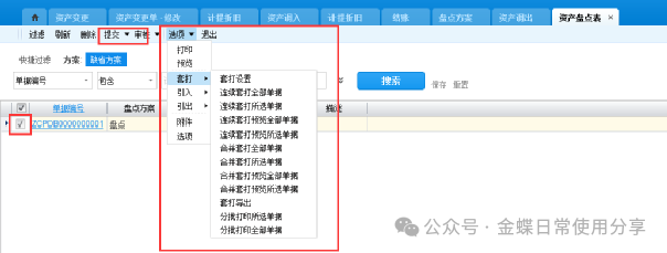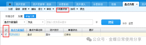 注:当一张卡片包含多个物料时,在调出时这张卡片上的所有物料都会调出,如果只要部分调出,需要对该张卡片进行拆单。 3.6固定资产盘点【业务场景】:企业用户对固定资产进行盘点 【用户角色】:管理会计 【功能菜单】:【资产管理】->【固定资产】->【资产盘点】->【盘点方案】 【操作说明】:选择资产组织、填写名称、设置本次盘点范围及盘点选项,并提交审核。盘点整个资产组织的资产,则不设置盘点范围,只盘点个别范围内的资产,则选择盘点范围。 提交审核后,回到盘点方案列表,选中盘点方案并点击生成盘点表 系统生成盘点表 选中需要盘点的盘点表,在选项中,点击套打,选中连续套打所选单据进行套打 实际盘点完之后,填写资产盘点表,选中本次盘点的盘点表,填写盘点数据,并提交审核。 根据盘点的结果,如果盘点数量与系统数量有差异系统会自动生成盘盈盘亏单 选中没有审核的盘盈盘亏单,提交审核。 3.7固定资产折旧计提3.7.1固定资产固定折旧 【业务场景】:企业用户对固定资产进行固定折旧 【用户角色】:管理会计 【功能菜单】:【普通用户】->【资产管理】->【固定资产】->【折旧管理】->【计提折旧】 【操作说明】:根据设定的折旧政策,若政策中新增资产卡片当月不计入计提折旧,计提折旧的当前会计年期即为启用年期,计提的只有初始资产。 若组织使用的折旧政策中设定新增资产卡片当月要计入计提折旧,计提折旧的当前会计年期即为启用年期,计提的是本月所有新增资产 折旧之后,系统自动生成折旧调整单,审核折旧调整单并生成凭证。 3.7.2固定资产变动折旧 【业务场景】:企业用户对固定资产进行变动折旧 【用户角色】:管理会计 【操作说明】: 1. 新增资产卡片时,勾选折旧方法字段下参数“按变动进行折旧”,则会按照该折旧方法下动态折旧公式进行折旧; 2. 若新增卡片时未勾选以上参数,后续做资产变更,变更了财务页签下信息时,会自动勾选该参数,然后按照该折旧方法下动态折旧公式进行折旧; 3.如果资产变更了财务页签下信息,还是想按照静态折旧公式进行折旧,可以勾选折旧政策中的参数“折旧要素变动时按静态折旧方法计算”;
