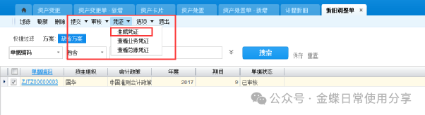 3.8固定资产期末处理3.8.1生成凭证 【业务场景】:企业用户对固定资产进行期末处理并生成计提折旧凭证凭证 【用户角色】:管理会计 【功能菜单】:【资产管理】->【固定资产】->【折旧管理】->【折旧调整单】 【操作说明】: 选择需要生成凭证的单据,点击“生成凭证”,生成计提折旧凭证,还可以通过列表中查询单据的业务凭证及总账凭证。 生成资产卡片凭证 在资产卡片中选择需要生成凭证的单据,点击“生成凭证”选择归属的账簿,点击“凭证生成即可”。 如果购买智能会计平台,则可以在智能会计平台,一次性生成所有的资产凭证及计提凭证。 3.9结账【业务场景】:企业用户对资产管理模块进行结账 【用户角色】:管理会计 【功能菜单】:【资产管理】->【固定资产】->【期末处理】->【结账】 【操作说明:结账之前需要完成计提折旧及相关凭证生成。