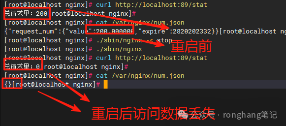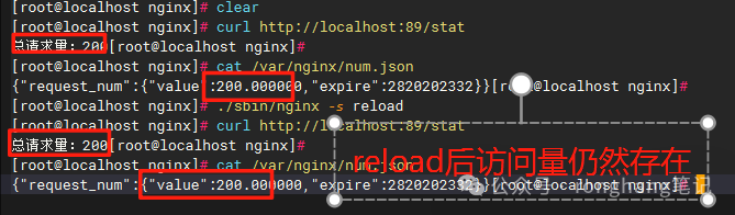 重启 nginx 验证,共享数据是否仍然存在,reload 后数据不会丢失,stop 再启动数据丢失。