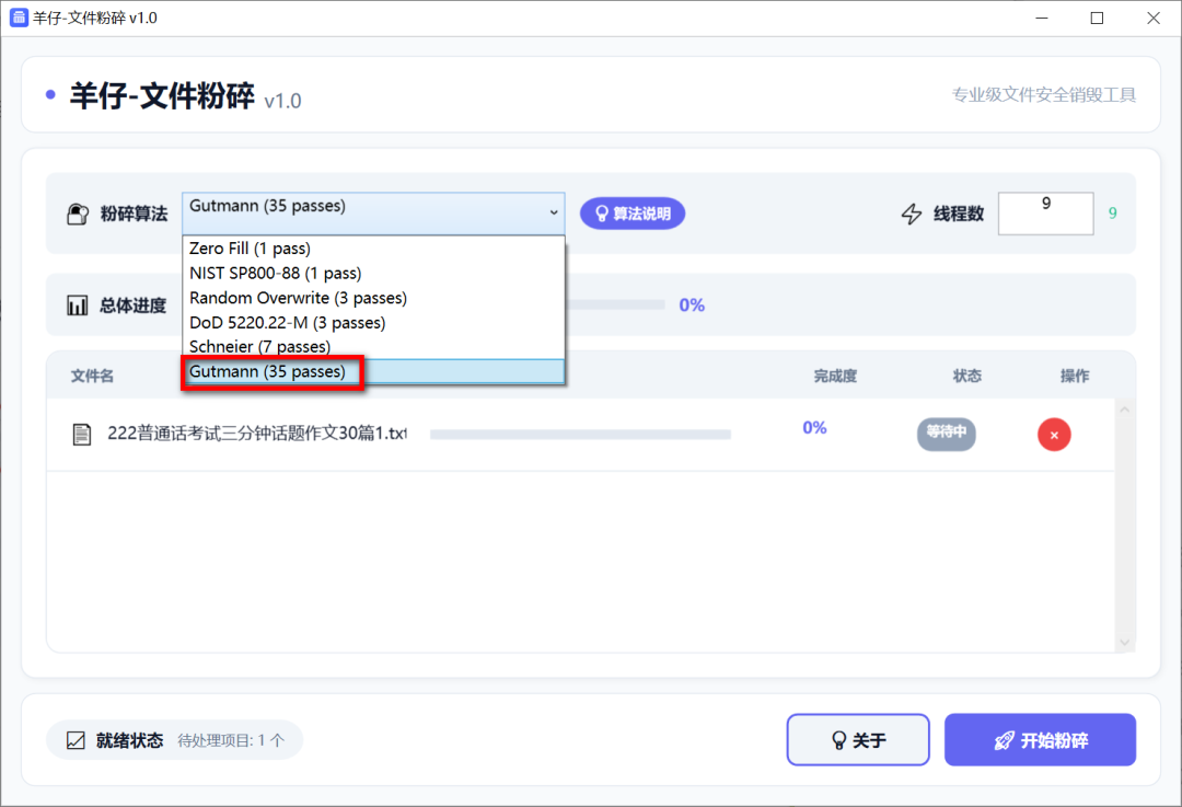 提供6种粉碎算法,日常使用选择DoD就够了,如果你有隐私焦虑,就选择Gutmann,开始粉碎前后悔了,可以点击移除项取消。