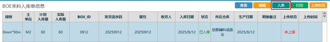 6.进入入库界面后,查询对应的BOE组件来料单,如果找不到可以通过编号和名称查找。最后点击查询。 同时有需要的话可以在下方勾选自己想要的显示选项。 ![]() 7.查询到对应订单之后,按图操作:先进行入库,再上传BOE。 ![]()