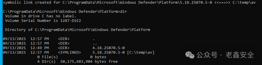 Windows Defender 始终阻止将文件写入其运行文件夹,“ Platform ”文件夹也不例外。 但是,如果是创建一个新文件夹而不是写入文件,会怎么样呢? 毋庸置疑,完全可以在“ Platform ”文件夹中创建任意名称的文件夹。 So,结合之前Windows Defender 如何过渡到新版本的信息,如果在“Platform”中创建一个以最高版本号命名的文件夹,Defender 会将这个文件夹用作其执行文件夹 之后,在“Platform”文件夹中创建一个指向新路径 (C:\temp\av) 的目录符号链接(SYMLINK )。确保 SYMLINK 名称对应于“ Platform ”中现有文件夹的最高版本号。例如,如果当前版本为“4.18.25070.5-0”,那么创建一个名为“5.18.25070.5-0”的 SYMLINK,以保证此 SYMLINK 具有最高的版本号。