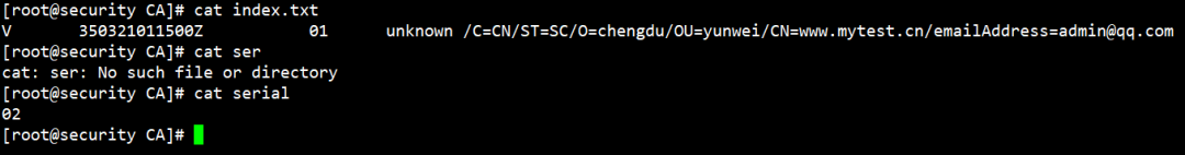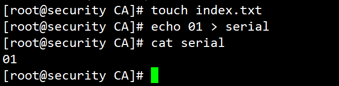 3、执行如下命令生成根证书并且创建两个文件,分别是index.txt和serial,index.txt使用touch创建即可,serial中输入01。openssl req -new -x509 -key private/cakey.pem -out cacert.pem -days 3650