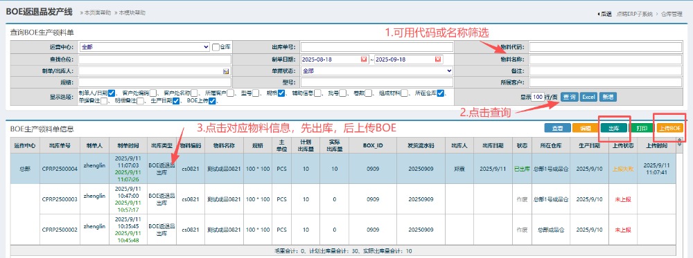 ![]() ![]() 1.进入ERP系统之后,在左侧的功能菜单里找到“BOE定制”,点开“成品返退”,点击“新增返退品发产线出库”。 2.进入界面后,按图操作:选择发货仓库,备注可根据需要补充。 3.接下来在下方点开“物料编码”,会有物料信息窗口弹出。 在弹出的物料信息窗口内,按图操作:点击选择物料大类,点击查询。然后点击对应物料信息。 4.选好物料之后,检查确认库存和发货数量,以及BOXID和流水码。点击提交选择“待出库”或“立即出库” 5.提交后,回到左侧功能菜单找到“返退品发产线出库确认” 6.进入界面后,按图操作:可用代码或名称筛选查找,点击查询。然后点击对应物料信息,先进行出库,再上传BOE 流程结束。 下一步教程跳转链接: 点晴ERP-BOE返退品生产入库流程 点晴模切ERP更多信息:http://moqie.clicksun.cn,联系电话:4001861886 该文章在 2025/9/22 16:33:38 编辑过 |