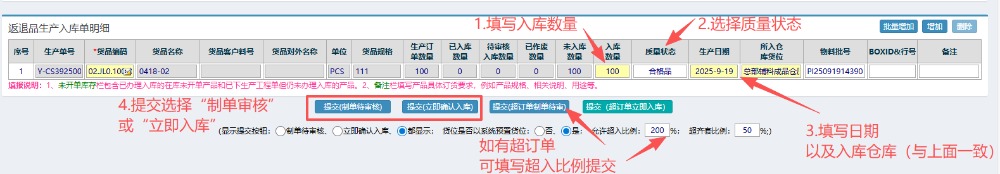 接着按图操作:填写入库数量、日期以及入库仓库(要与上面一致)。然后提交选择“制单待审核”或“立即入库”。 注:超订单是指超出订单内指定的数量 ,如有超订单可填写超入比例提交 5.提交之后,回到左侧功能菜单里找到“返退品生产入库管理” 6.进入界面后,按图操作:点击选择物料大类,点击查询。然后点击对应物料信息(合格品或制损品),先进行入库,再上传BOE。 ![]()