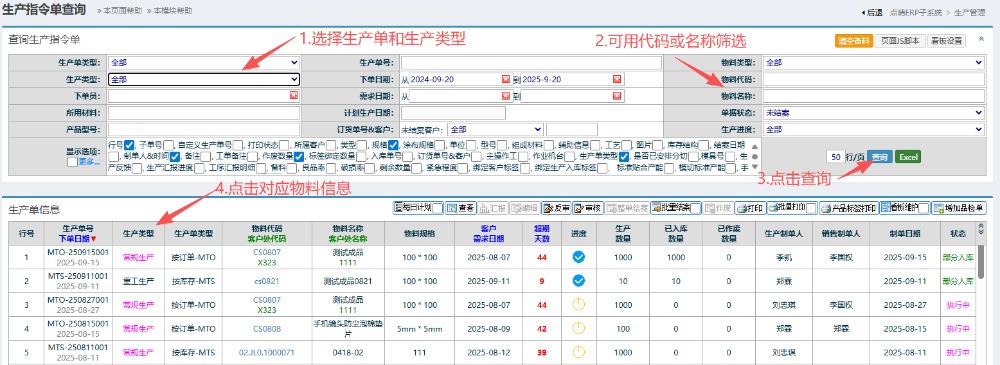 6.进入界面后,按图操作:选择生产单类型,可用代码或名称筛选。点击查询,确认当前生产单类型。 ![]()