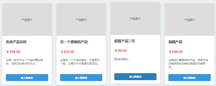 <p class="product-description">这是另一个产品的描述,可能更长一些,以展示卡片高度的灵活性。</p>