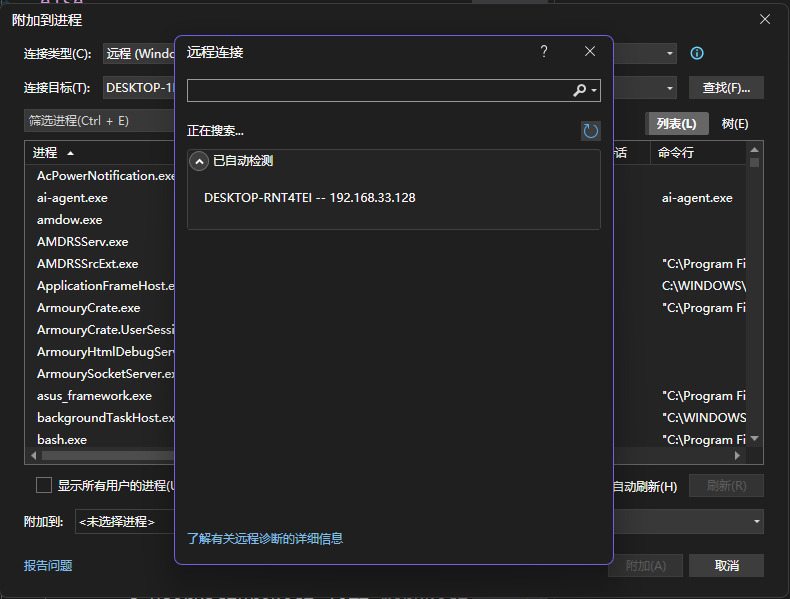 当你配置了部署目录,可在配置管理器里,将部署勾选上。 ![]() 之后即可启动调试。将会自动连接并调试测试机(或虚拟机)的程序。 连接成功后,测试机(或虚拟机) ![]() “ 方法二通过附加到进程的方式进行调试。 在开发机 VS ,菜单栏-调试-附加到进程,连接类型选“远程(Windows - 无身份验证)”,然后查找,顺利的话,将会显示对应的远程调试目标。 ![]() ![]() 连接成功后,再选择对应进程,附加到该进程上: ![]() 之后即可开始调试。 “ “ 该文章在 2025/9/23 12:58:38 编辑过 |