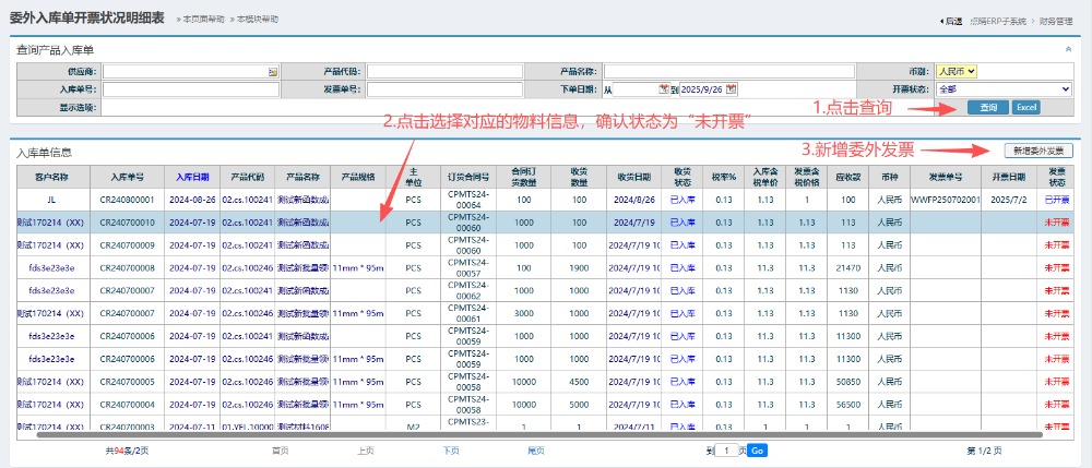 2.进入界面后,先点击查询,再点击选中对应的物料信息,确认状态为“未开票”,然后就点击右边新增委外发票