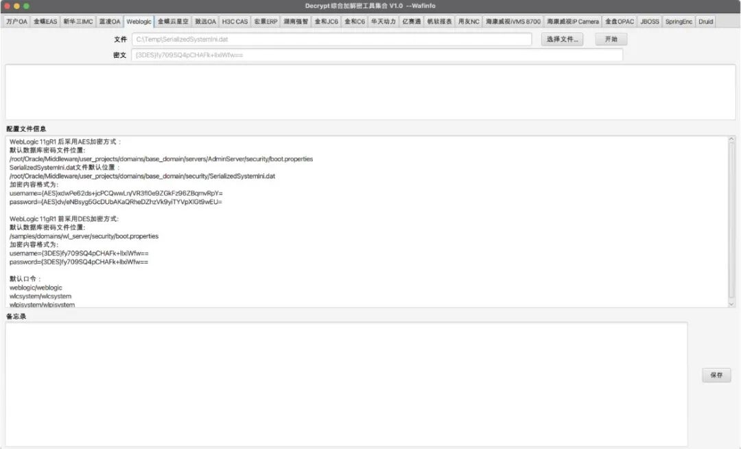 DecryptTools是一款面向渗透测试和后渗透阶段设计的综合加解密工具,其核心功能在于快速解密各类系统加密数据(如数据库连接字符串、用户凭证等),同时支持AES、RSA、SM4等多种加密算法及逆向提取的专有加解密逻辑。该工具覆盖了20余种主流OA系统,包括万户OA、用友NC、金蝶云星空、致远OA、海康威视安防平台(iSecure/IVMS 8700/IP Camera)等。