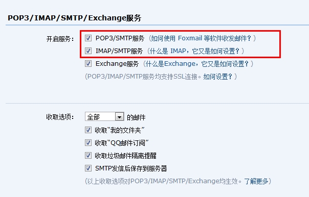 如何打开POP3/SMTP/IMAP功能?为了保障用户邮箱的安全,QQ邮箱设置了POP3/SMTP/IMAP的开关。系统缺省设置是“关闭”,在用户需要这些功能时请“开启”。 首先,登录邮箱,进入设置-帐户; ![]() 然后,在“帐户”设置中,找到设置项,进行设置,如下: ![]() 最后,保存设置,即打开了相应的服务。 该文章在 2014/4/11 10:34:16 编辑过 |